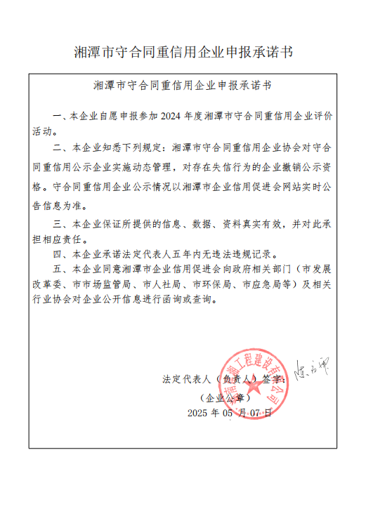 本企業(yè)根據(jù)《湘潭市守合同重信用企業(yè)申報(bào)規(guī)定》等編制 2024 年度企業(yè)信用報(bào)告書(shū),并保證本報(bào)告書(shū)內(nèi)容真實(shí)、準(zhǔn)確、完整。