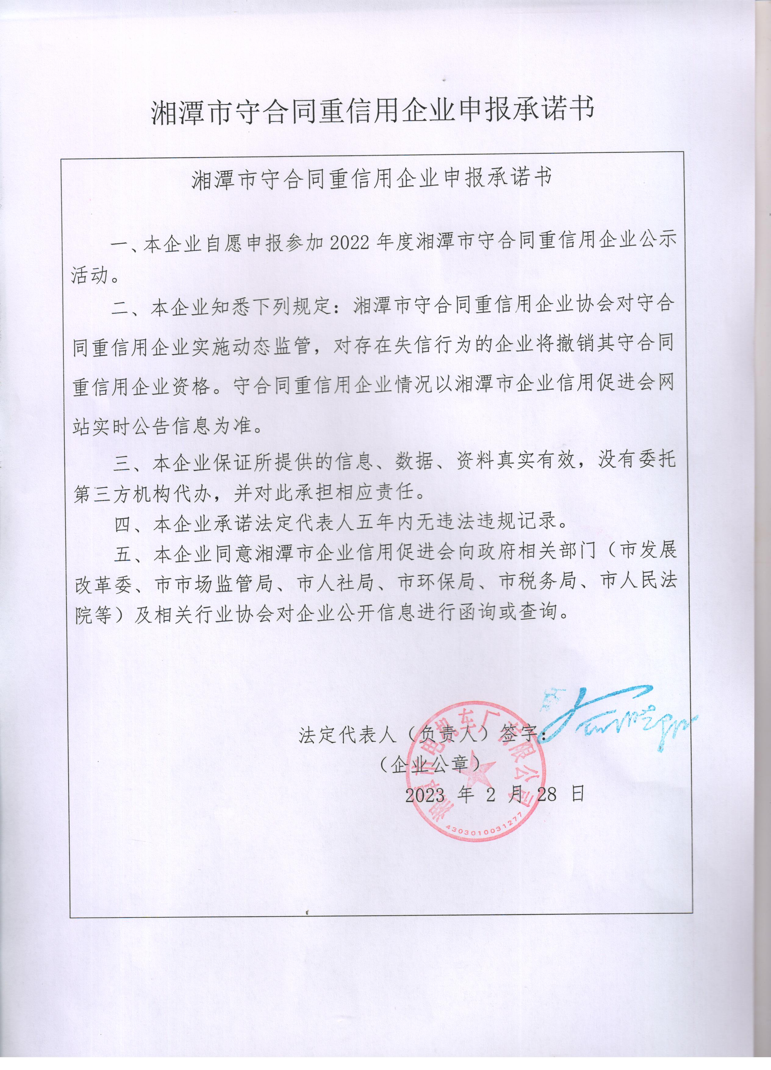 本企業(yè)根據(jù)《湘潭市守合同重信用企業(yè)申報規(guī)定》等編制 2022 年度企業(yè)信用報告書,并保證本報告書內(nèi)容真實、準(zhǔn)確、完整。